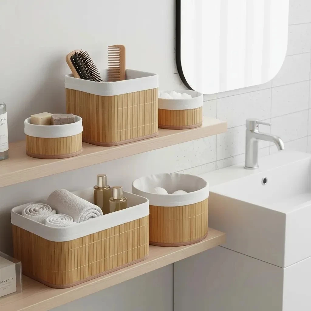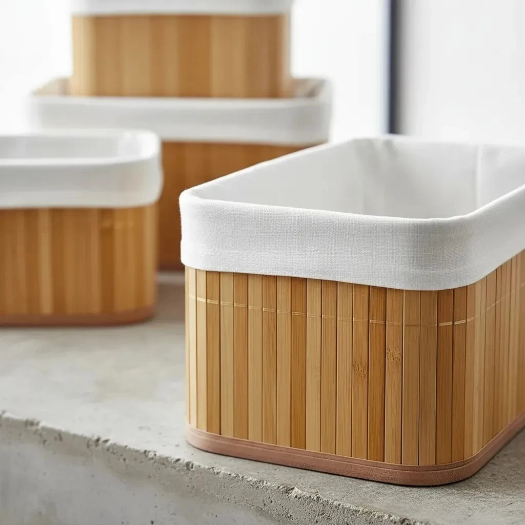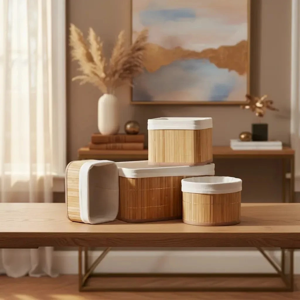 -18%Kit 4 Cestos Organizadores de Bambu com Forro – Decoração Elegante para Casa